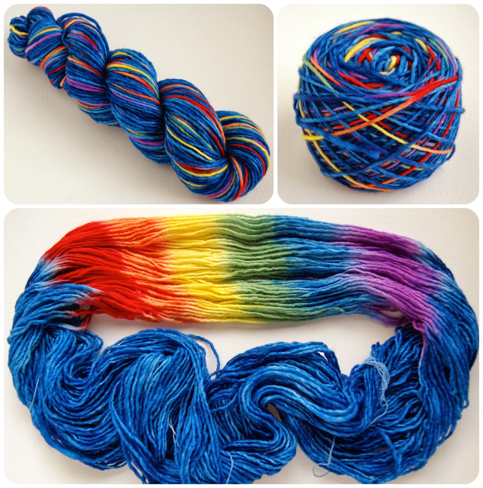 Here's another set I did using acid dyes and the above method. Except I accidently splashed some dye on the white part of the skein and ruined the dye job. :( So I decided to overdye the undyed part black, and call it "Vampire Farts" instead! It was helpful to thicken a bit of the black dye with guar gum and then hand-paint the two edges where the black meets the red and purple edges of the rainbow. I then dipped the larger part of the undyed skein in a bath of black dye to finish the job and I didn't have to worry about the black wicking into those two edge colors.